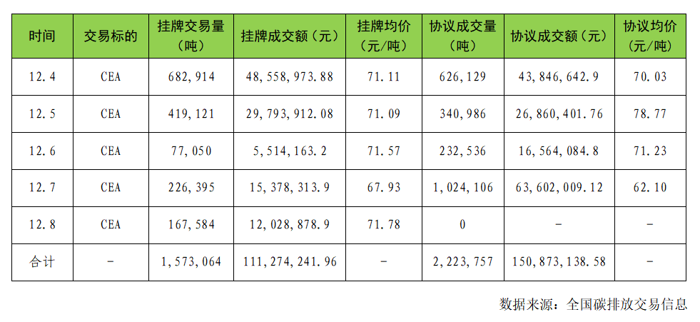 本周(12月4日至12月8日)全國碳市場(chǎng)綜合價(jià)格行情為:最高價(jià)72.90元/噸,最低價(jià)65.58元/噸,收盤(pán)價(jià)較上周五上漲0.26%。本周掛牌協(xié)議交易成交量157.31萬(wàn)噸,成交額1.11億元;大宗協(xié)議交易成交量222.38萬(wàn)噸,成交額1.51億元。本周全國碳排放配額總成交量379.68萬(wàn)噸,總成交額2.62億元。截至本周,全國碳市場(chǎng)碳排放配額(CEA)累計成交量4.27億噸,累計成交額238.6億元。具體交易情況如下: