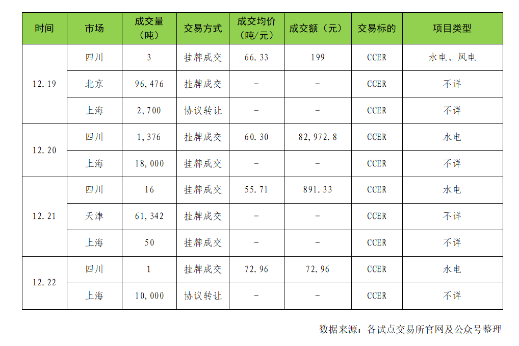 本周(12月18日至12月22日)各試點(diǎn)交易市場(chǎng)中,國家核證自愿減排量(CCER)總成交量為19萬(wàn)噸,較上周下降81.56%,其中最高成交均價(jià)為四川聯(lián)合環(huán)境交易所72.96元/噸,具體交易情況如下: